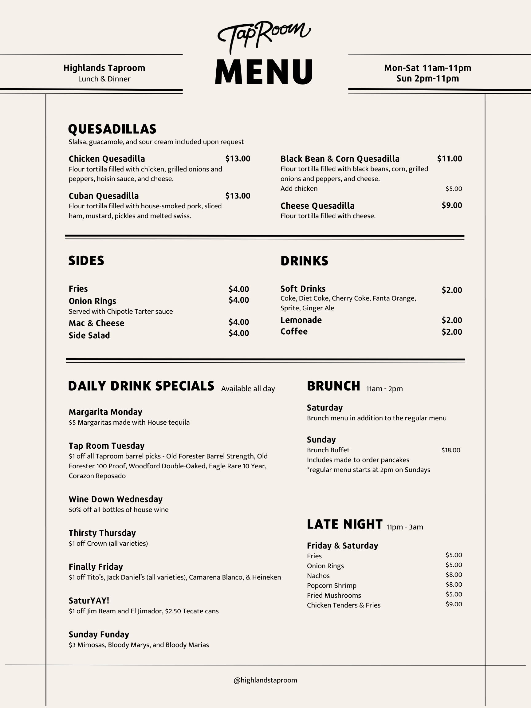 Full menu is served 11am-11pm Monday-Saturday and 2pm-11pm Sunday